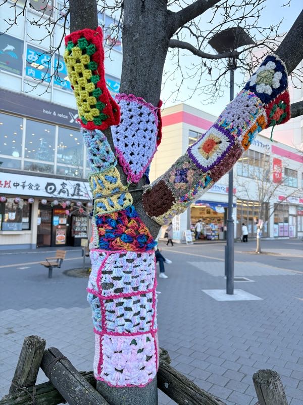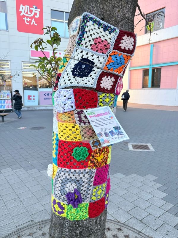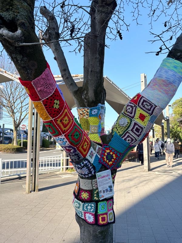 街路樹に毛糸の編み物の飾り?が