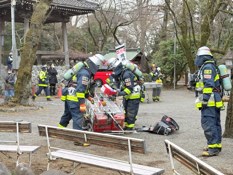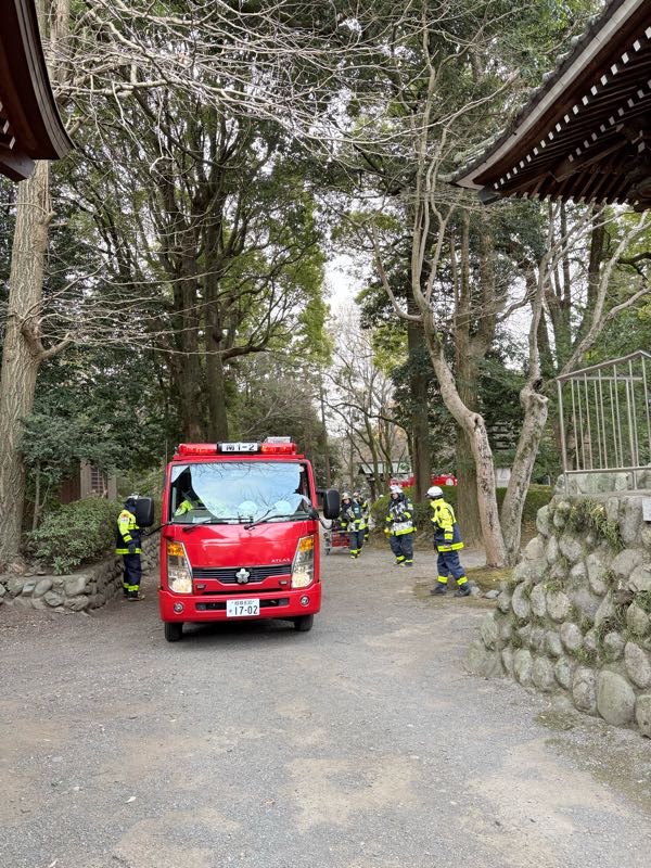 本堂前の植え込みから出火という想定!