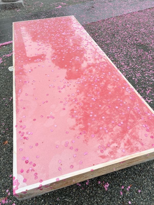 散り始めてもいて腰掛ける場所に桜の花びらデザインを作り出していました。